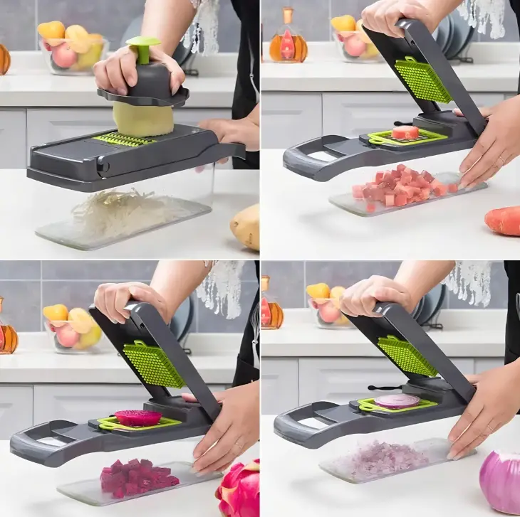 Haz que cada receta sea más fácil y emocionante con esta picadora multifuncional, creada para quienes disfrutan cocinar sin complicaciones. Con 13 cuchillas intercambiables, podrás cortar, rebanar y trocear una gran variedad de frutas y verduras: pimientos, papas, tomates, cebollas, pepinos, zanahorias y mucho más.